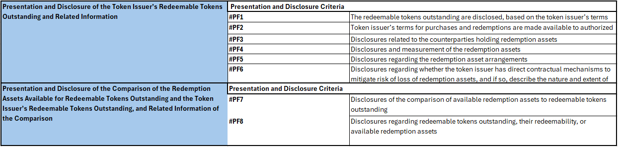 For each criterion however, additional detailed scoping and “point of focus” guidance needs to be applied. For example, in arriving at the redeemable token outstanding disclosure (#PF1 criteria), token issuers will need to be able to define the natively minted token quantity for all tokens in scope which includes:
